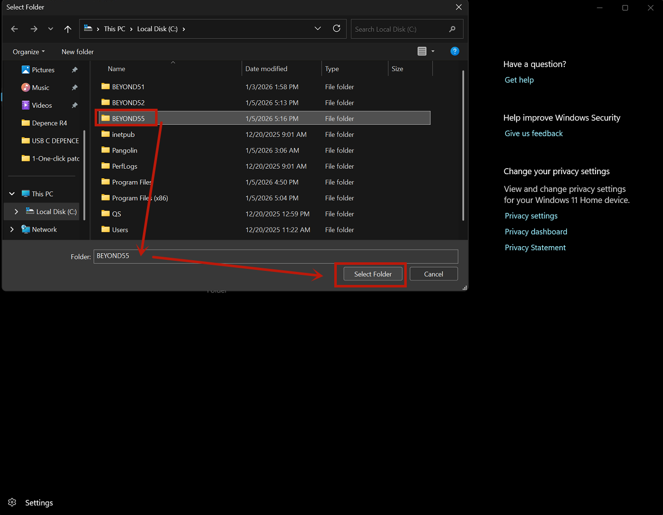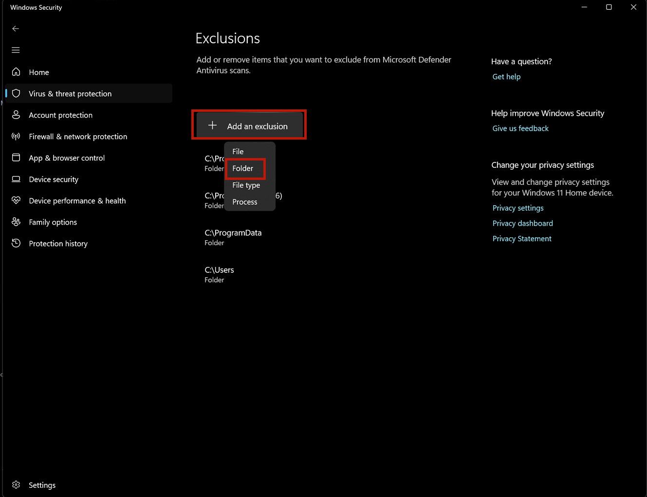 - Click – Add exclusions 🟦 Click on item 2 – Folder