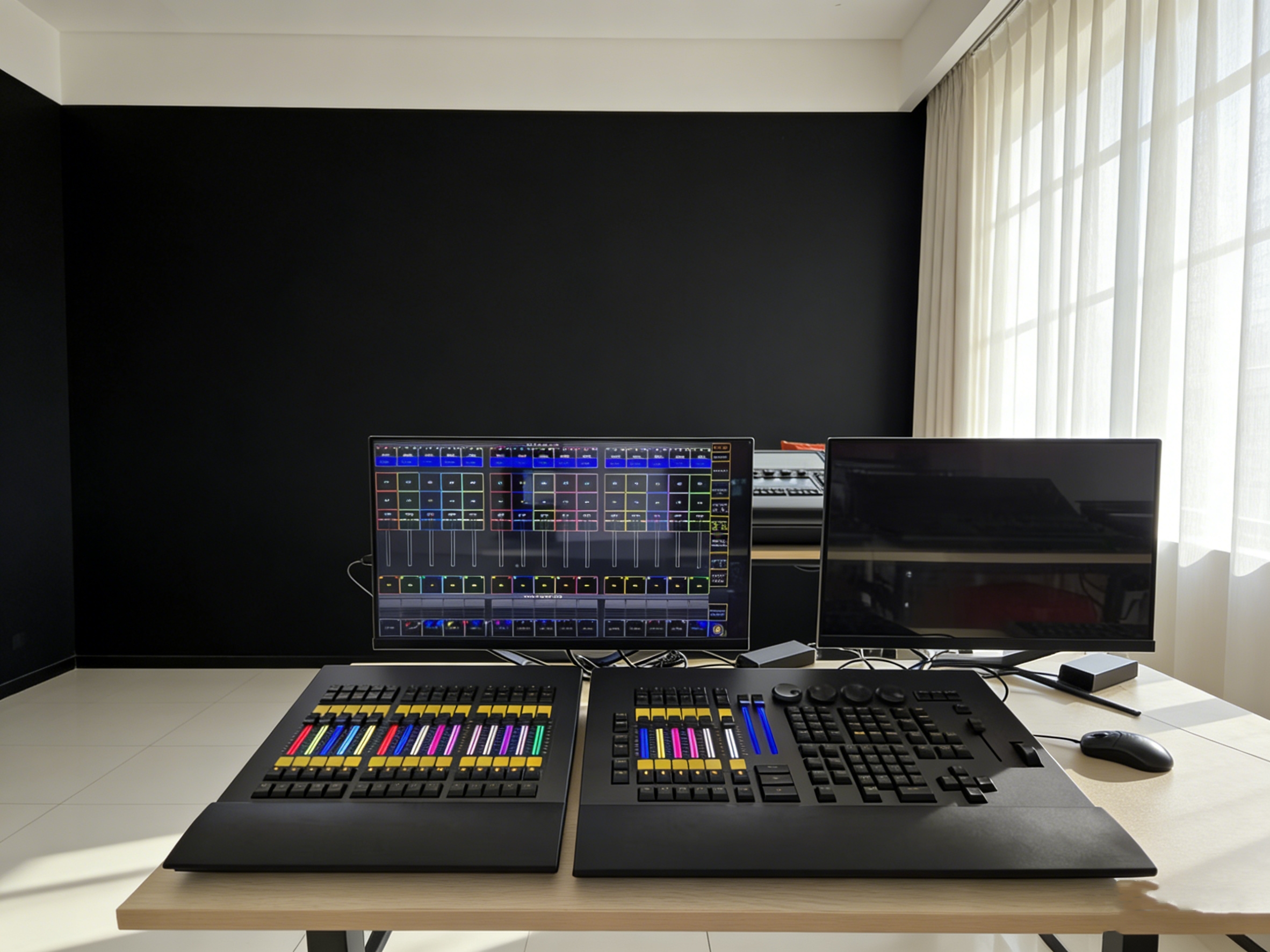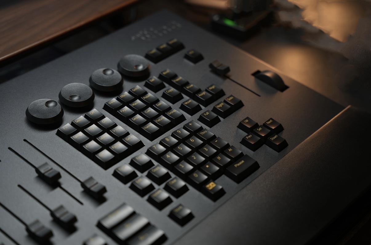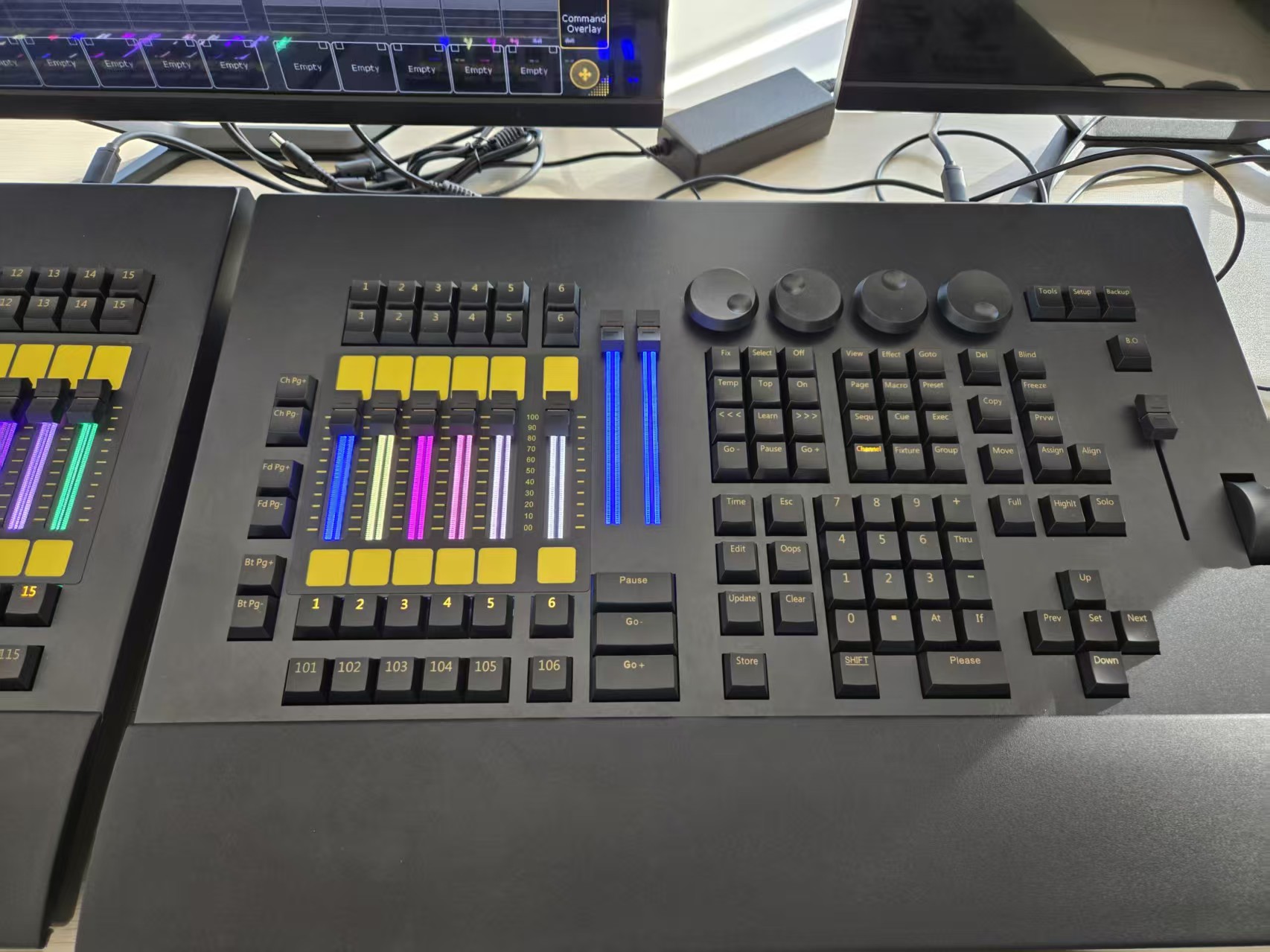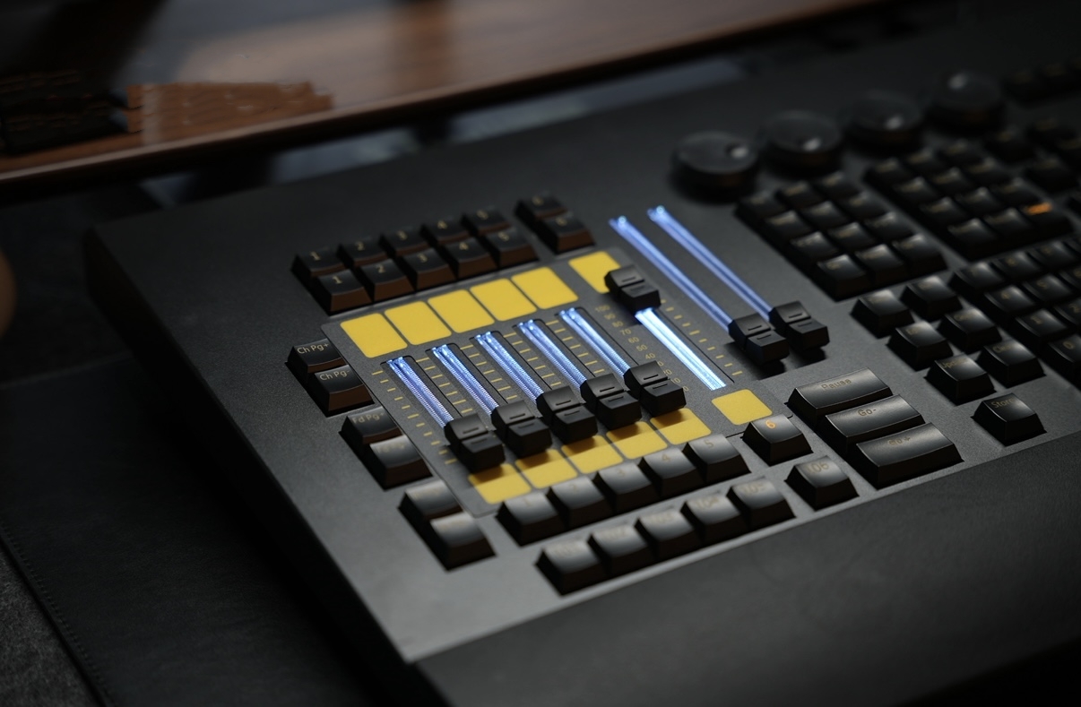 - 1 master fader, 2 AB faders (RGB backlight) , 6 program playback faders (RGB backlight), 12 program storage function keys.