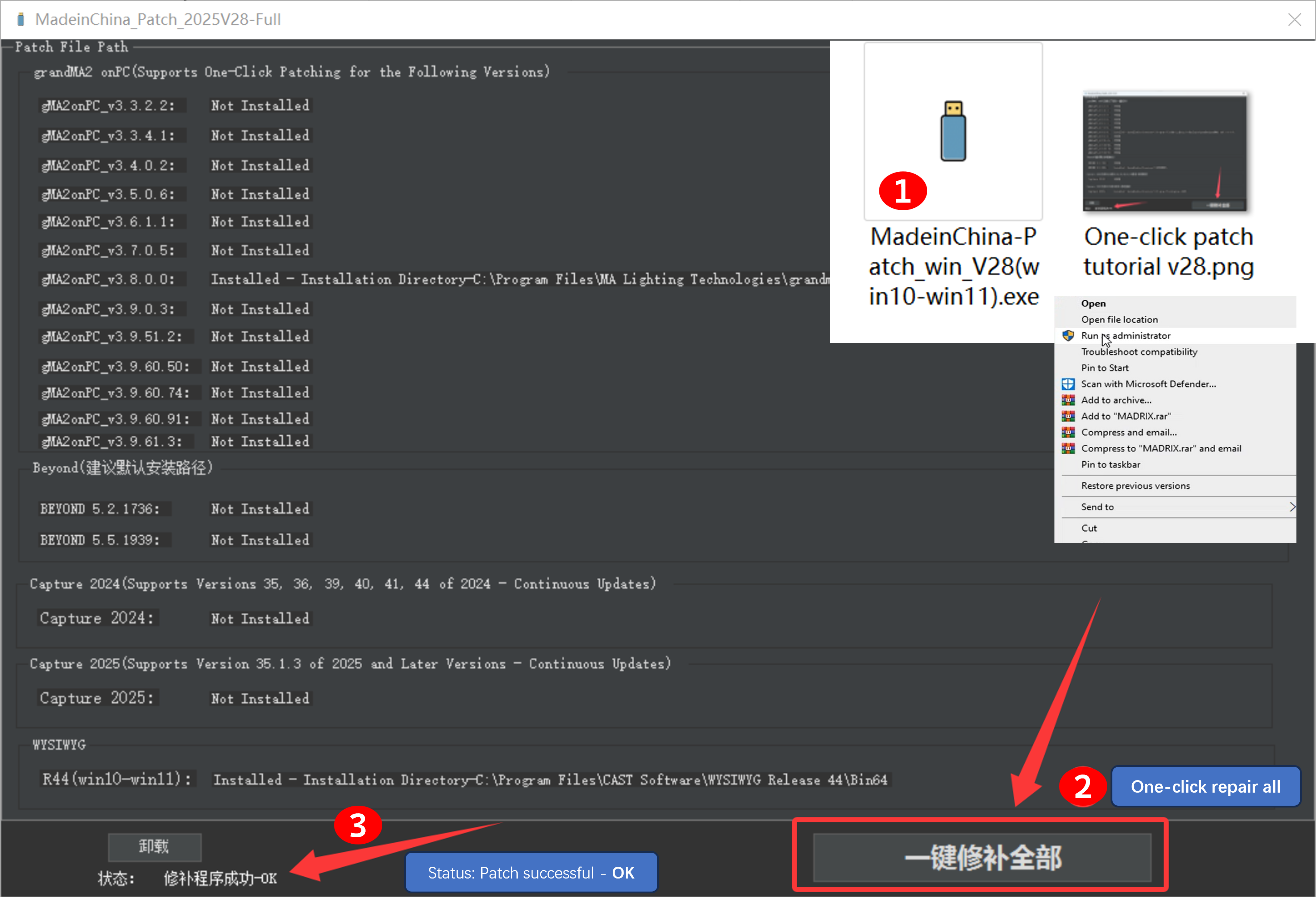 Run One-click patching_V28 as an administrator (as shown in the example image)