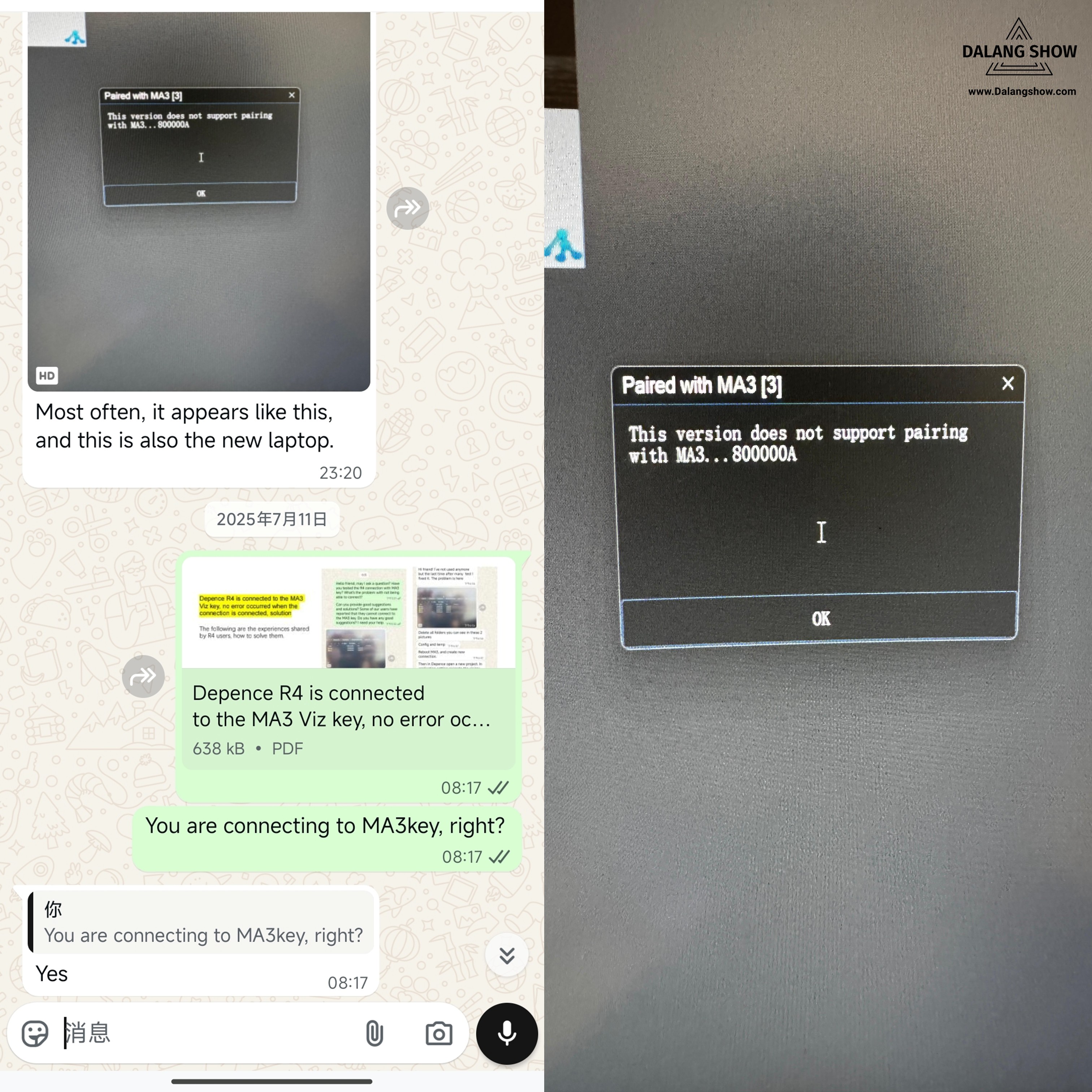 - Issue: When connecting Depence R4 to grandMA3 viz-key, a pop-up window appears stating that this version does not support pairing.